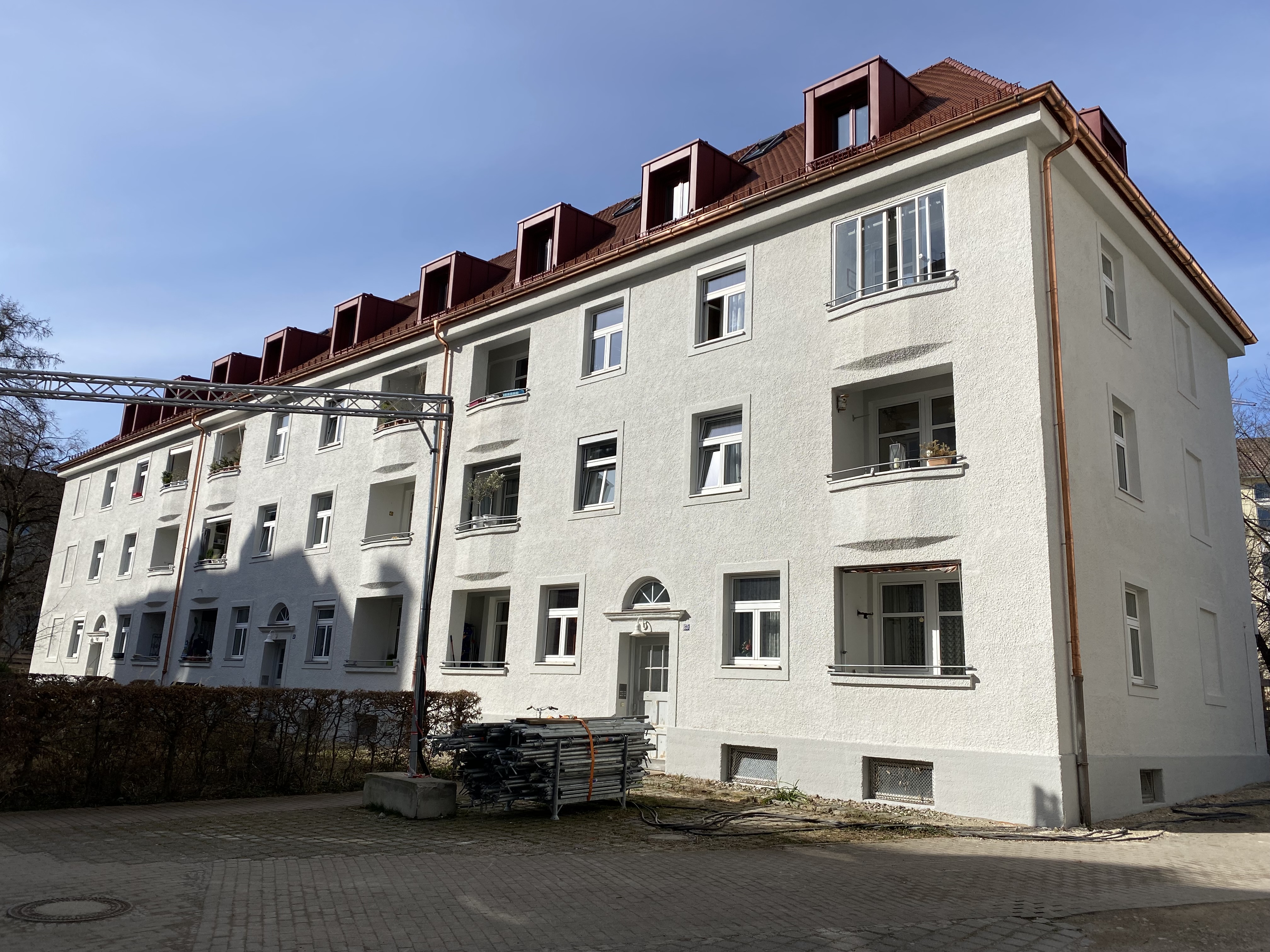 Der Innenausbau der Dachgeschosswohnungen ist in vollem Gang und die Malerarbeiten an der Fassade sind demnächst abgeschlossen.