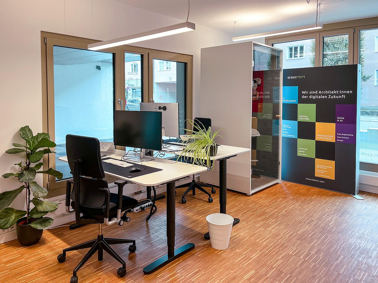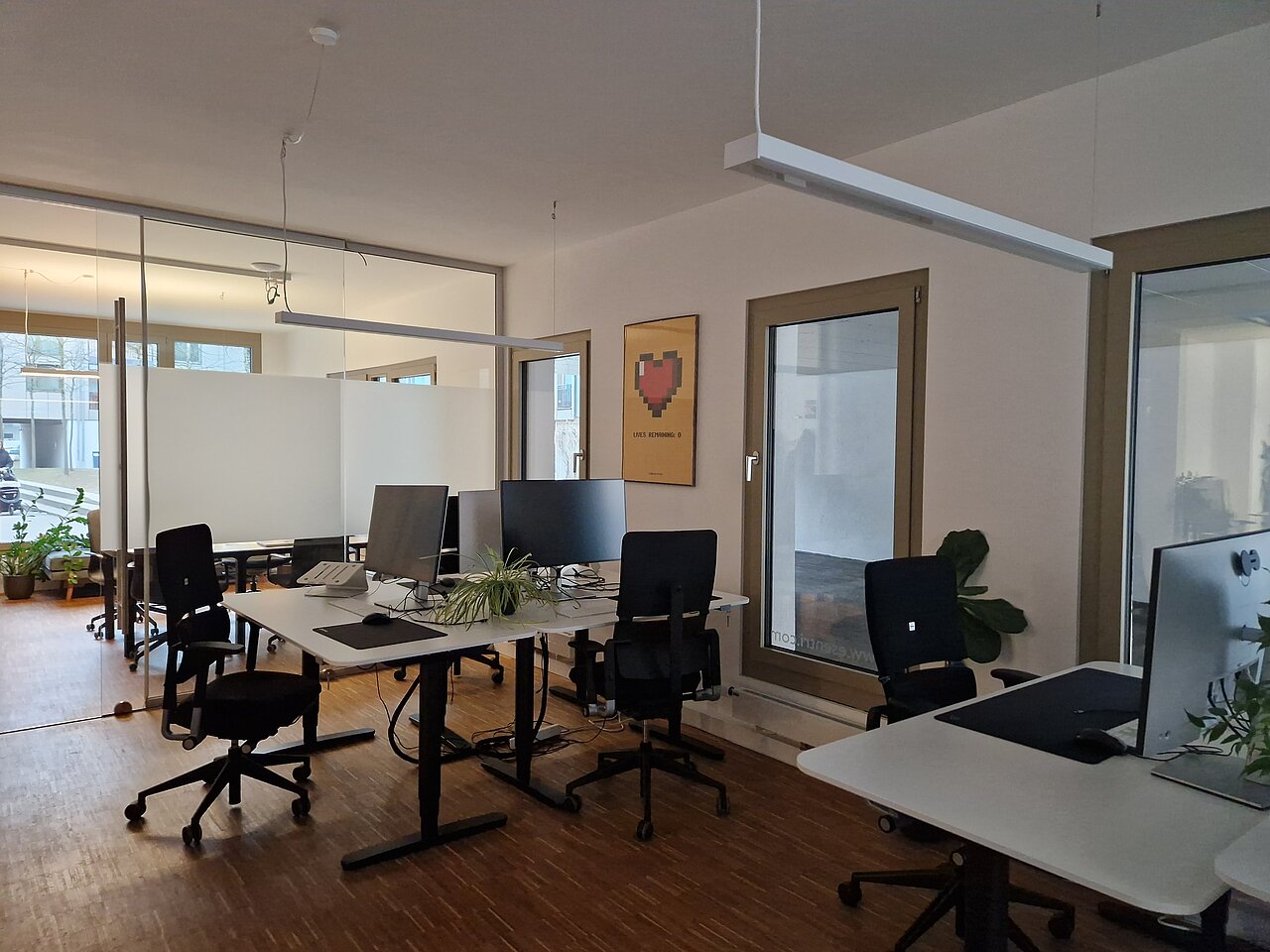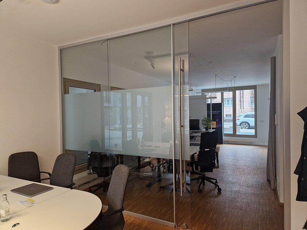 Die Gewerbefläche ist durch hochwertige, bodentiefe Schiebe-Glaselemente und Trockenbauwände in mehrere Arbeitsbereiche unterteilt.